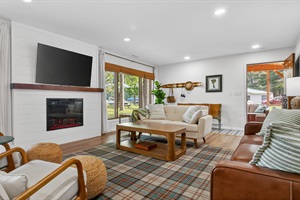 Open Living Space: Light and bright living room with lake views, cozy seating, flat-screen Roku TV, and an electric fireplace.